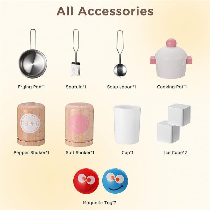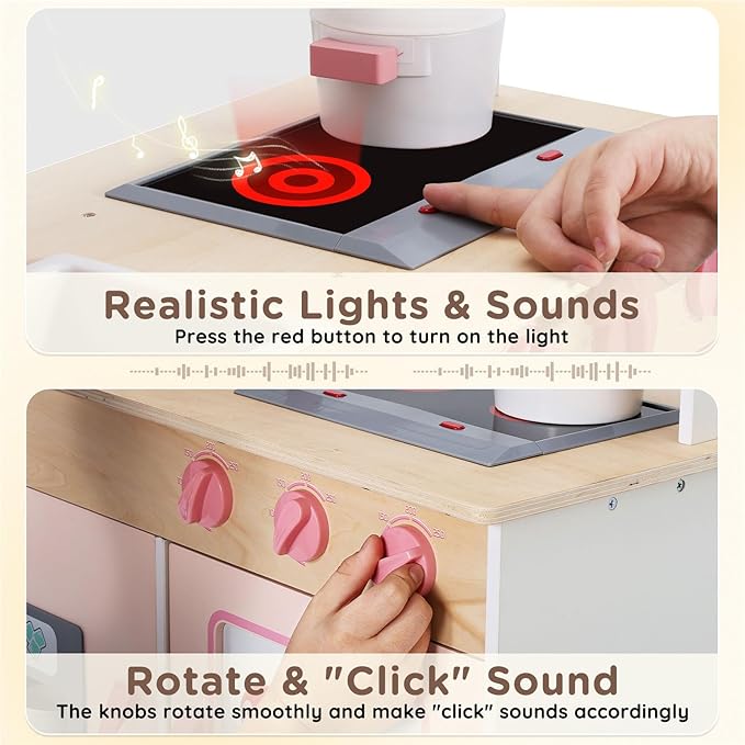 - High-Quality Construction: Crafted from premium, durable wood, this play kitchen set is built to withstand hours of imaginative play, ensuring long-lasting fun for your little chef