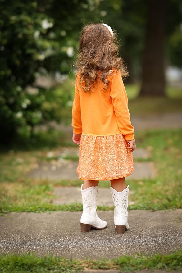 - Charming and Unique Design: This toddler princess dress blends cozy sweatshirt comfort with playful flair. The bright orange top displays Moana and sailing elements, while the lower half features a full orange mesh skirt adorned with sparkling sequins. The layered look adds movement and a cheerful glow to every step