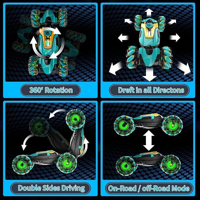 - 360°-Multiple Stunts:awesome stunts such as Drifting all direction, moving sideways and revolving 360° Forward/backward,turn right/left, right/left drift, extreme 360 rolling, double-sided 4WD driving, transform mode,Whether playing indoors or outdoors, remote car are thrilling way for kids to explore physics and mechanics,will keep them captivated for hours,Very cool kids toys boys 6-8-12