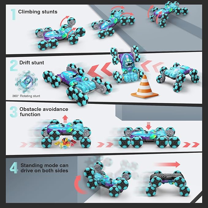 - 2 Remote Control: Experience the versatility of our RC car with two control options. The 2.4GHz remote ensures precise handling, while the gesture control adds a layer of interactive fun, perfect for mastering stunts and tricks