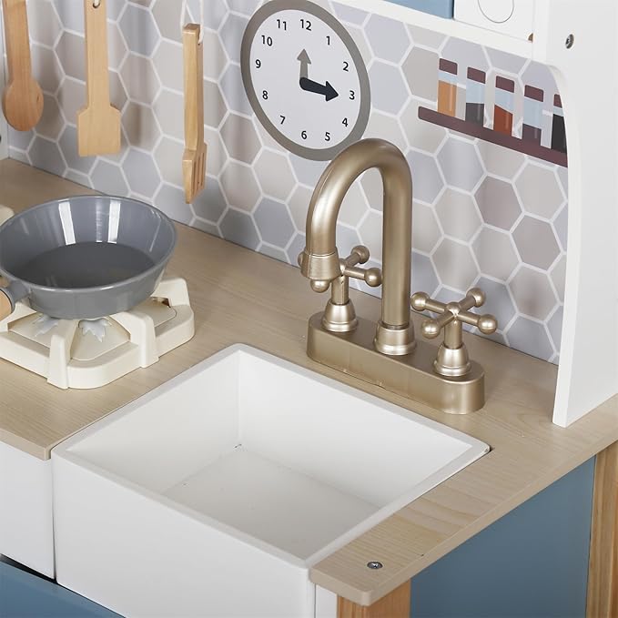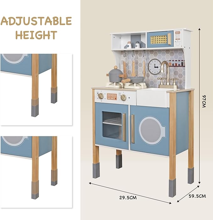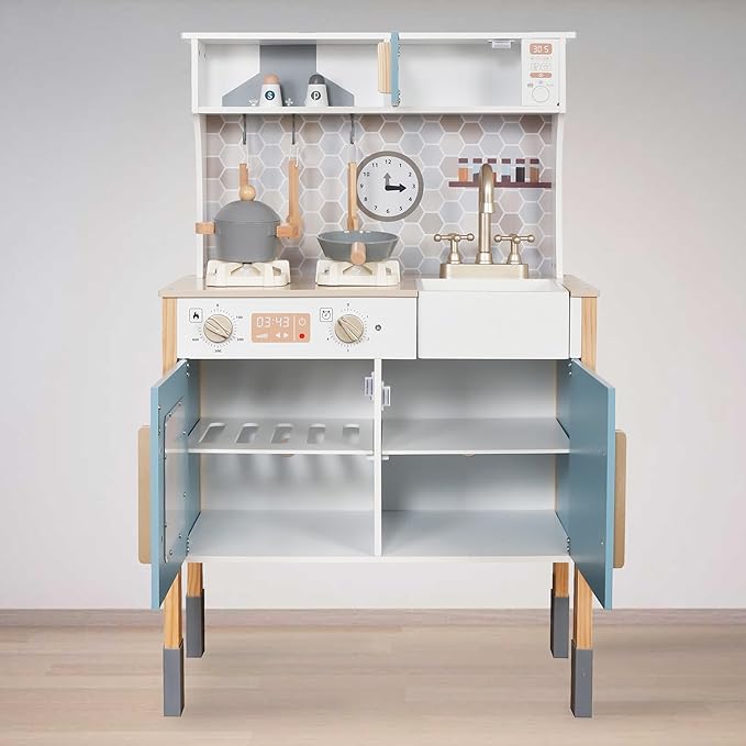 - ❥Toddler kitchen has enough storage space to cultivate children’s storage ability and develop a good habit of tidying things up. Perfect play kitchen for toddlers 3-8. The wooden toy encourages role-playing, problem-solving, and fosters a love for cooking and pretend play game