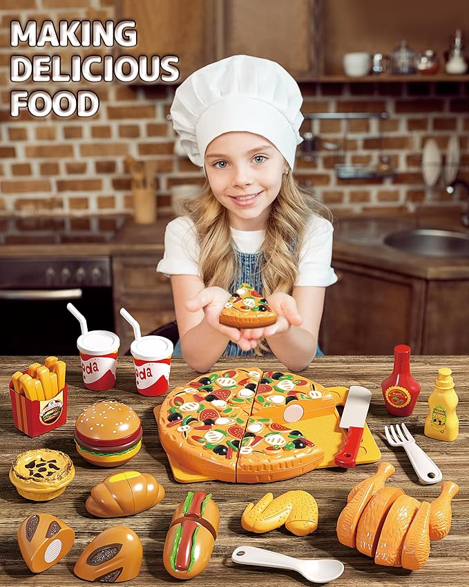 - 【Interactive Pretend-Cut Design】Kids can safely explore food preparation with our play set! The toys feature secure hook-and-loop attachments that mimic a realistic "cutting" experience, helping develop hand-eye coordination. Children will enjoy discovering colorful foods, identifying their shapes, and creating imaginative role-play scenarios—all through tactile play.