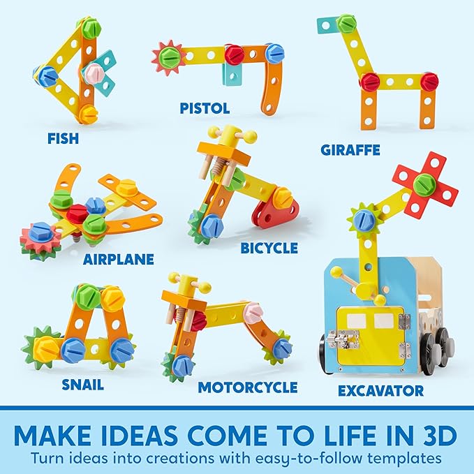 - Rich Accessories Set: Includes 51 pieces: a tool box, hammer, screwdriver, wrench, saw, 4 wheels, 3 gears, 10 screws & nuts, and 13 assembly pieces. The bright colors and diverse tools provide endless fun and learning in building games, making it a fantastic gift for 3-year-old boys and a great addition to toddler toys for ages 3-4