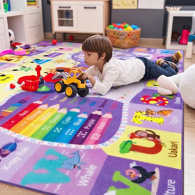 Kids Rugs for Playroom Bedroom Classroom Nursery, Non-Slip and Washable Rugs for Children Toddlers Girls, Educational and Fun Rug Carpets with ABC Alphabet Animals Shapes, 6x9, Purple