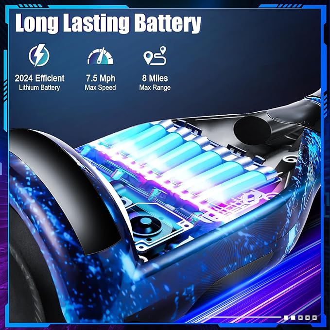 - Dazzling LED Lights: Make a statement while riding with vibrant LED tunnel lights flashing in six different colors, offering both style and safety. The LED indicator lights allow easy monitoring of battery life and hoverboard status, ensuring peace of mind during your adventures.