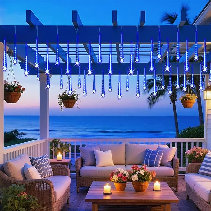 - 【Romantic Christmas Decoration Effects】These meteor cascading LED lights each beads fall in sequence then have a slight delay on each tube, just like meteor shower or falling snow across the night sky, which shows a super beautiful display. If you buy more than one set and hang them down in a circle around the eaves, the effect is spectacular