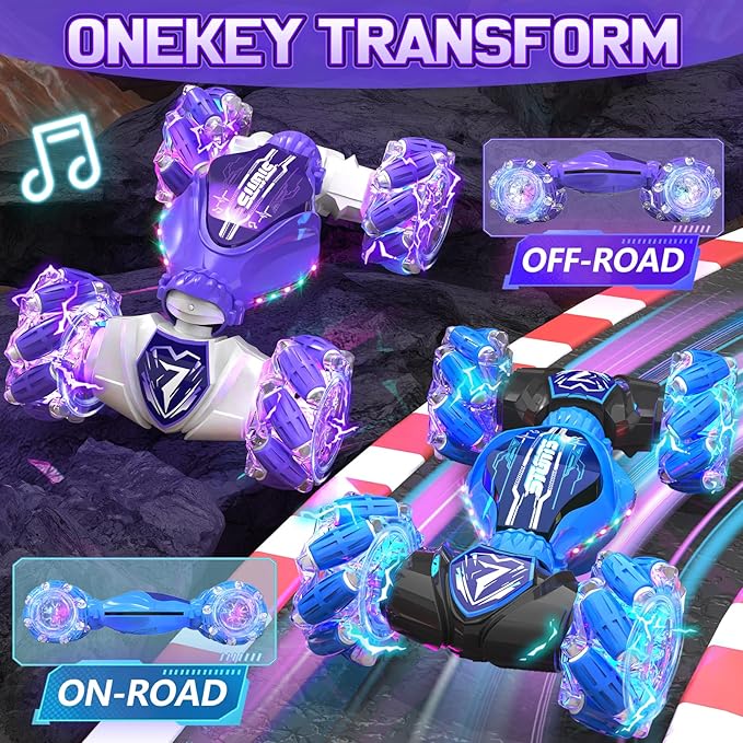 - 360°Rotating Transformer RC Stunt Car with Lights & Music: The 4WD stunt car with 4 LED Lights wheels and Backlight, can 360°Rotating, unning forward, backward, left, right, move 45° forward and backward, move body up & down. The rc car is designed for kids who love adventure and excitement! The RC Cars come with music and shocking lighting like a real car,The rc drift car can vividly restore racing scenes and provide superior gaming experience for both kids.