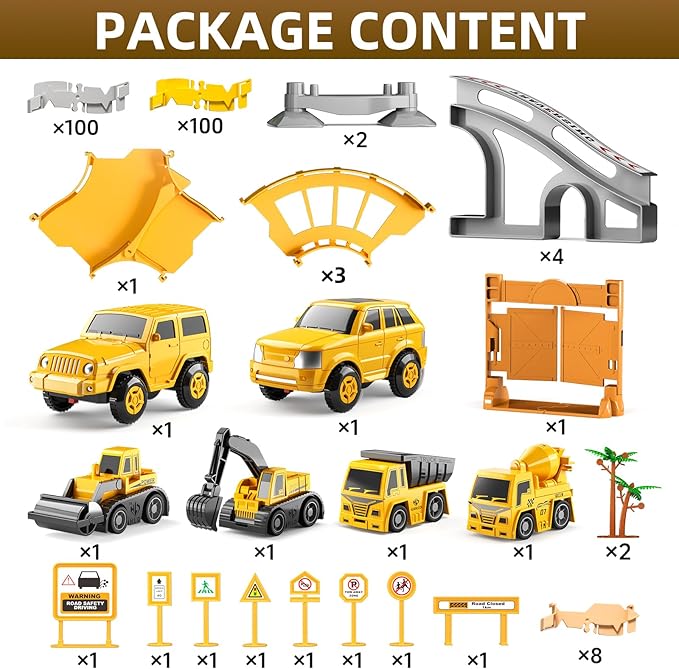 - Construction Racing Railway Toy Suit: Racing railway for toddlers include 200 railway components, 2 electrical racing car, 4 small construction trucks for toddlers 3-5, 8 traffic marks, 2 Y-shape railway, 3 winding railway, 2 trees, 4 bridge and 1 barrier