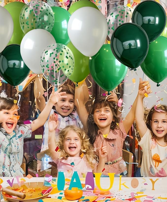 - Variety Pack: This 300-piece set includes 12-inch green, dark green, light green, white, and green confetti balloons in different shades for a jungle safari theme