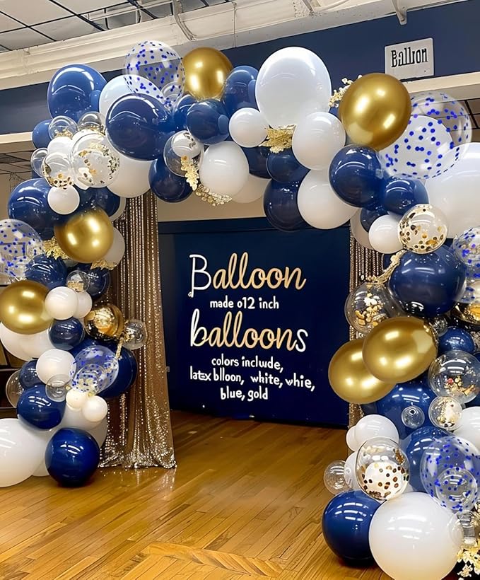 - Quantity and size: This set 300 pcs 12 inch balloons includes 100 Navy Blue, 100White, 50 Gold, and 25 Blue confetti, 25 Gold confetti balloons to create a festive and eye-catching display