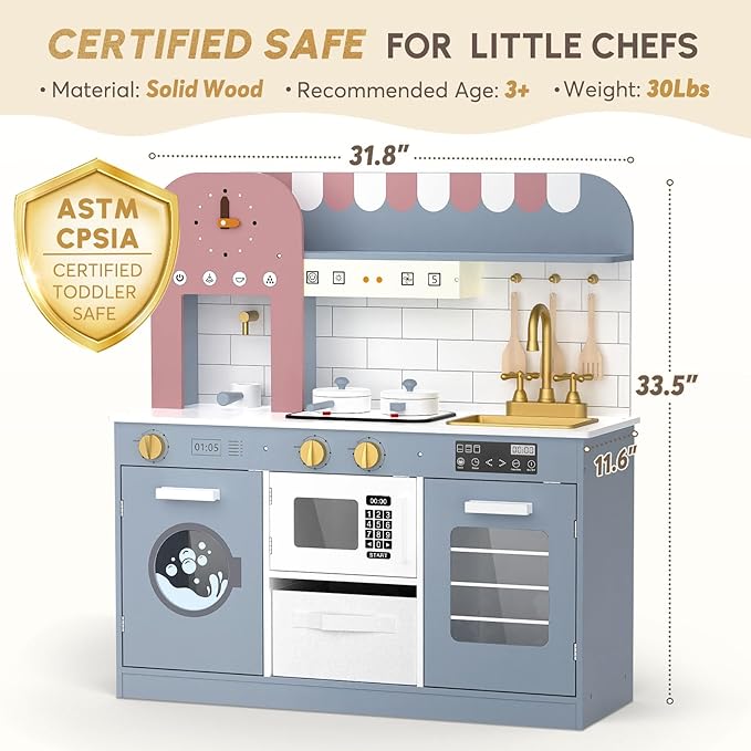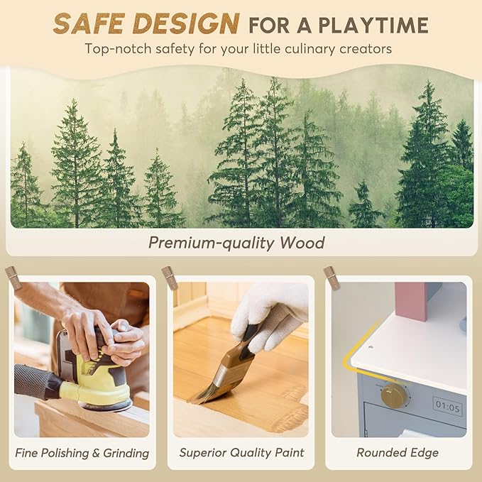 - Premium Wooden Play Kitchen: BIERUM play kitchen is crafted from ๐๐๐๐ & ๐๐๐๐๐ certified wood materials, ๐๐๐-๐ ๐ซ๐๐, and coated with non-toxic paint. It's sturdy & durable, and absolutely safe for kids. It also includes various cooking utensils with realistic with ๐ฅ๐ข๐ ๐ก๐ญ๐ฌ & ๐ฌ๐จ๐ฎ๐ง๐๐ฌ, making pretend play more vibrant and engaging.