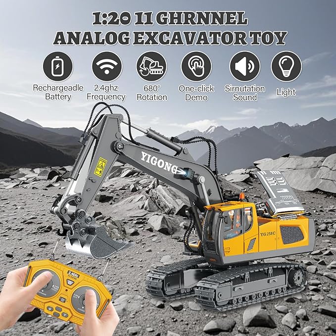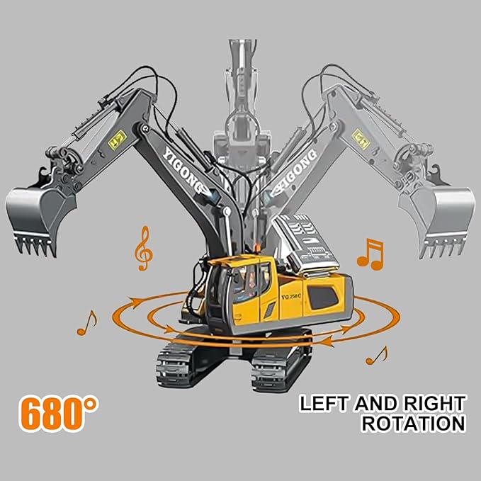 - 11-Channel RC Excavator:The RC excavator smoothly moves forward/backward,turns left/right,rotates 680 degrees,and spins 360 degrees in place.Features an alloy shovel,robust engine,realistic lights,and sound effects.Digs and moves loose sand effortlessly