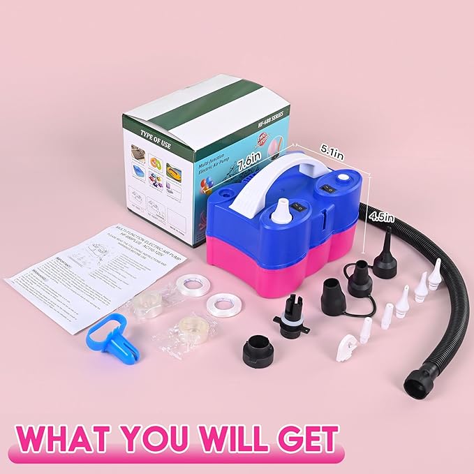 - 3-IN-1 Electric Balloons Pump: With this AC 110V-120V 600w electric air pump, you’ll receive everything you need for inflating various inflatables. You Will get 1 electric air pump with dual inflation ports and deflation port, 2 flat nozzles, 2 angled nozzles, 1 long bellow, 5 nozzles for inflating and deflating,1 balloon tying tool, 2 ribbons, and 2 balloon garland tool strips for easy party setup, a built-in removable balloon cutter for quick and effortless balloon cutting.