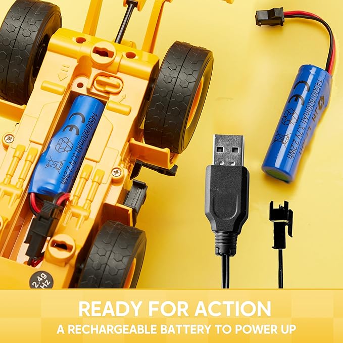 - RC Front Loader Fun Set: This construction toy set features a highly realistic RC Front Loader, two 600mAh rechargeable batteries, and an advanced 2.4GHz remote control