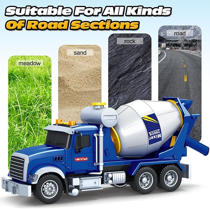 - Simulated Sound and Light: This unique mixer truck-building toy for boys comes with three sound and light effects (batteries included). It has buttons that toddlers can use easily. Boys aged 3-5 can press the button to play sounds and turn on the lights. Simulate the scene of carrying construction materials with sound and light effects, this is an ideal big truck toy for kids, it will bring a lot of joy and surprises. It is a perfect truck toy for 3, 4, 5, 6, 7, 8 years old boys and girls.