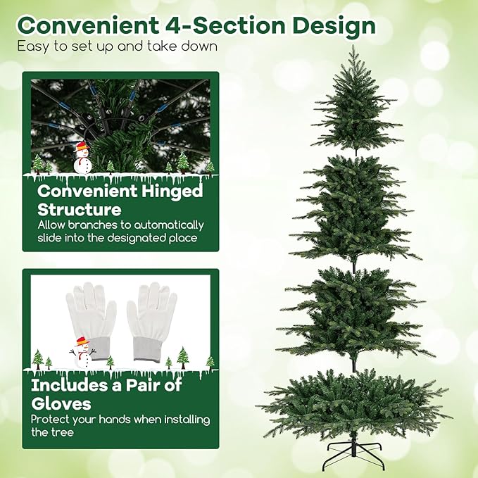 - Easy Installation and Convenient Storage: The artificial holiday tree is equipped with convenient hinged structures, allowing branches to automatically slide into the designated place. Additionally, it can be detached into 4 sections for space-saving storage when not in use.