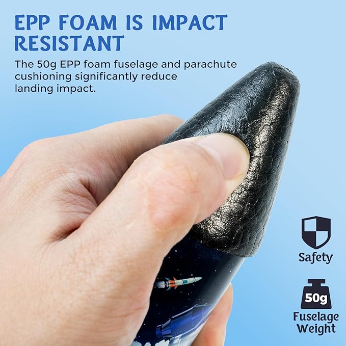 - 💪Safe and Stable Design: The upgraded circular propellers are lighter and softer, providing higher and more stable flights while being safe for kids. (Propellers must be installed before use.) The lightweight EEP foam body boosts launch height, and the parachute deploys automatically at peak altitude for a smooth landing.