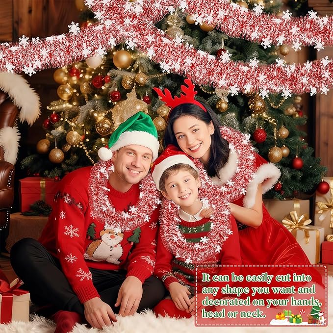 50Ft Christmas Red and Snowflake Tinsel Garland Metallic Twist Shiny Garland for Xmas Christmas Tree Ceiling Hanging Decorations Holiday Wedding Home Party Supplies Indoor Outdoor Decor