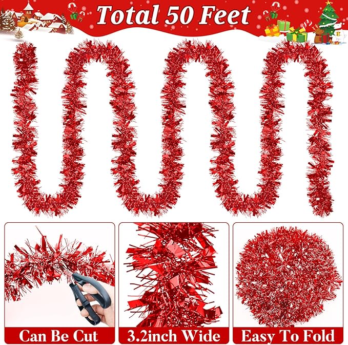 - 【Christmas Tinsel Garland Decoration】You will receive 1 piece of Christmas garland which measures about 50 feet in length and 3.2 inches in width, enough length and thickness to meet your needs in home decorations