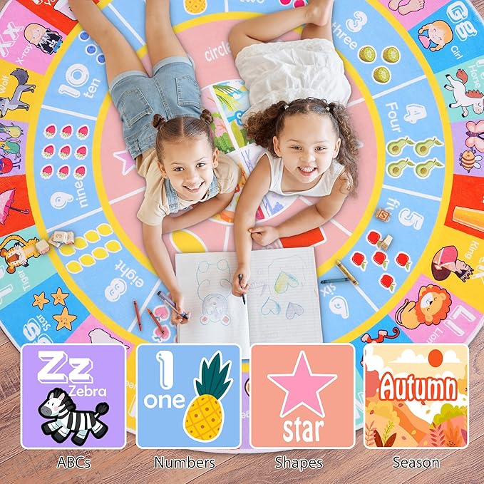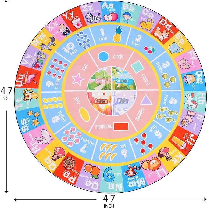 Kids Rugs for Playroom - Soft & Non-Slip 4x4 Feet Round Educational Rug for Learning ABC Alphabet, Numbers, Shapes & Map, Washable Classroom Rug for Toddler Nursery & Kids Room Decor