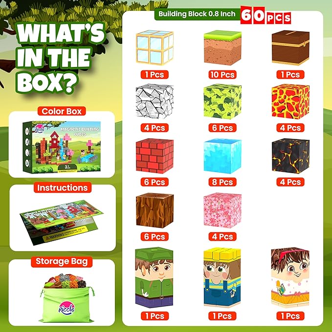 - Riccle Magnetic Building Blocks for Kids: Comes with 120 Magnetic Cubes for kids in vibrant styles, a handy magnetic building cubes storage bag for easy cleanup, and an idea booklet with fun designs to inspire creativity. A complete STEM magnets toys kit for endless magnetic building fun!