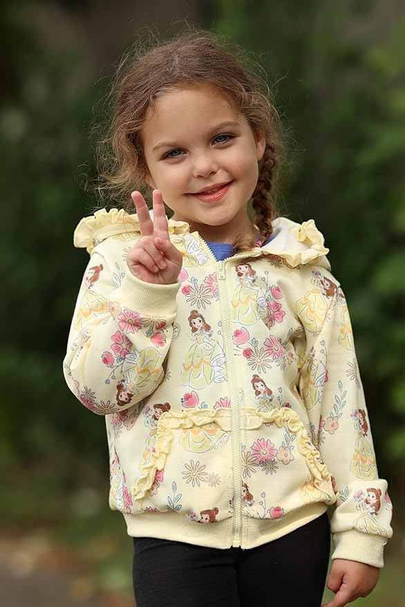 • Charming & Unique Designs: This adorable princess zip-up hoodie features an all-over print of Ariel, Cinderella, Moana, and Belle with delicate floral patterns. The soft pastel background adds a sweet touch. The full-zip design makes dressing easy, and the cozy hood adds warmth—ideal for cooler weather and perfect for layering in fall and winter. A must-have Disney princess jacket for girls