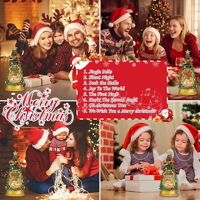 - Christmas music box:Slide switch to "Timer" (no music) Lights on for 6 hours, lights off for 18 hours, cycle every 24 hours. Slide switch to "MUSIC" to cycle through eight songs of Christmas Snow globe lights up, water and glitter keep spinning.