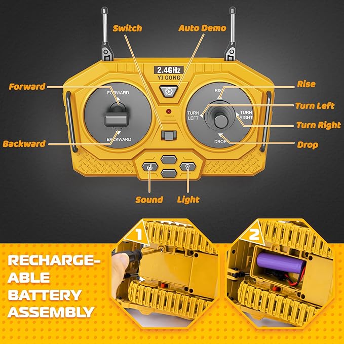 - 【Say Goodbye To Traditional Batteries】With the 2.4GHz frequency remote control , this bulldozer won't interfere with other remote control toys, multiple RC vehicles can be played with together. Comes with 3.7v rechargeable battery and battery charging cable. Say goodbye to constantly buying batteries with the rechargeable battery and charging cable included, providing long-lasting playtime