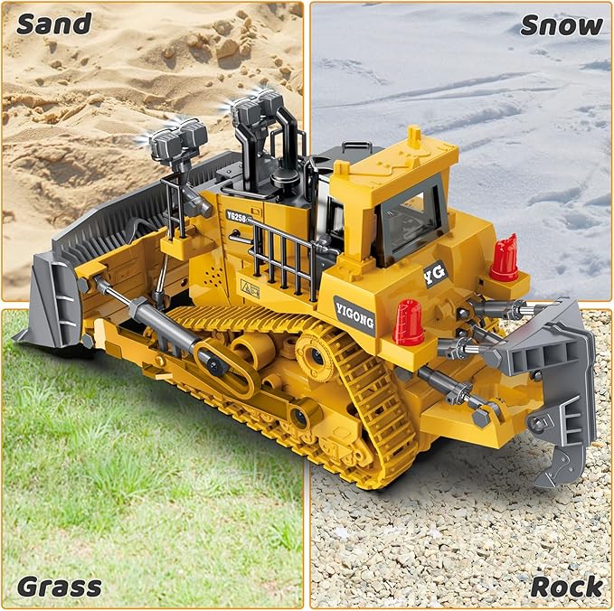 - 【Highly Realistic Remote Control Bulldozer】Step into the world of construction with our 2.4GHz remote control bulldozer toy. Our rc bulldozer has a simulated cab, metal shovel, tracked wheels, flashing headlights, and engine sounds. The remote control adds a new level of realism to the experience. Immerse yourself in the action and get ready for an adventure like no other