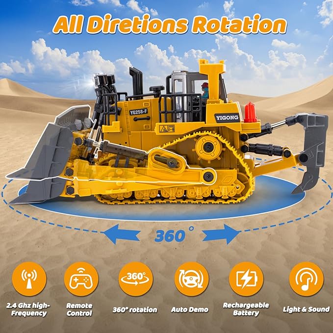 - 【Easy To Operate 9-Channel RC Loader】Our RC bulldozer features a 9-channel remote control that closely mimics the function of a real-life bulldozer. Forward, backward, turn left, turn right and even bulldozer arm lifting and lowering operations are all possible. The truck is 360° rotatable, you can easy to control it to all direction through remote. You can also easy to start with Auto Demo, Simply turn on the demo button to watch it in action and your kids will be ready to operate it