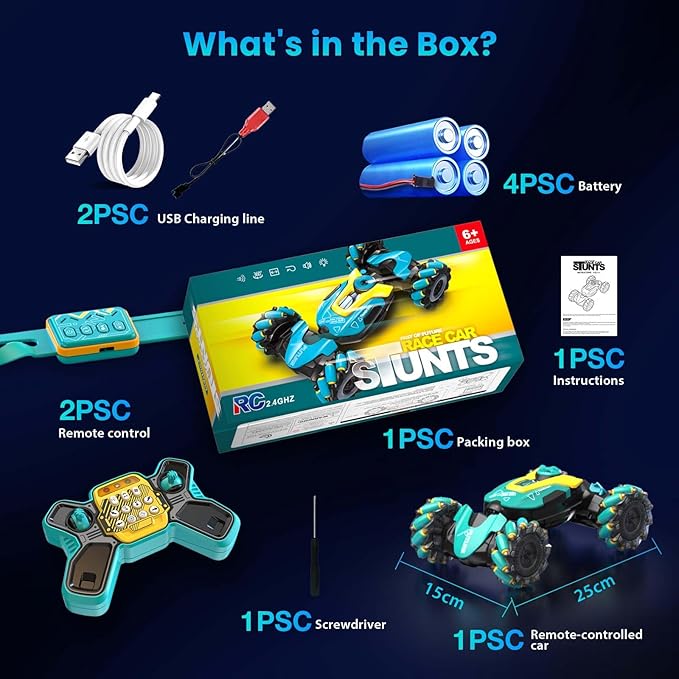 - đšď¸ăGesture Sensor Control & 2.4GHz Remote ControlăJust put on the sensing watch, and the hand-controlled RC stunt car will follow moving when your hand dance! You can also steer the gesture RC car with handle controller. Easy for kids to operate