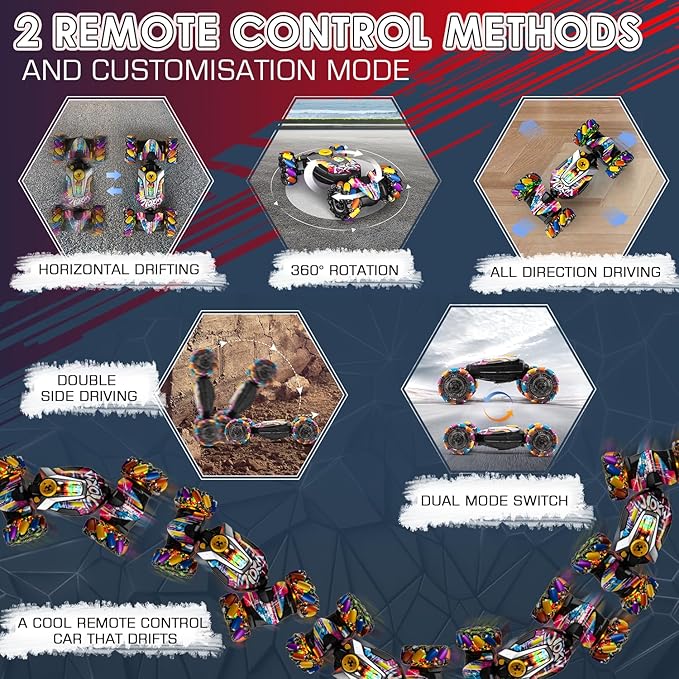 - The Perfect Gift for Kids: Our hand controlled remote control car with dynamic music, cool lights, spray effects, drift crossing, remote control, dancing, and more is the perfect gift for kids. Whether it's for Easter, holidays, Halloween, Christmas, birthdays, or special occasions, it's sure to delight sons, daughters, grandsons, granddaughters, nephews, and nieces alike.