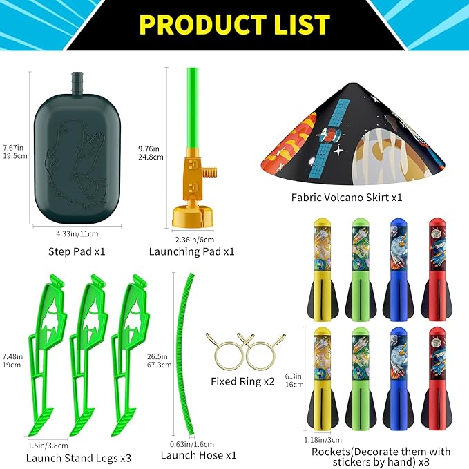 - Toy Rocket Launcher for Kids: Our rocket launcher set includes 8 multi-color foam rockets, 8 cartoon stickers, launch pad, and adjustable rocket launch stand with air hose. Recommended for ages 3 years and up