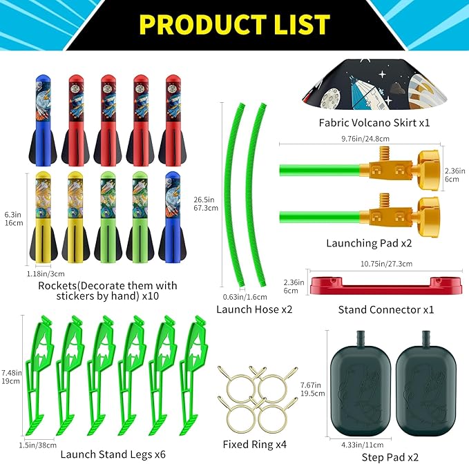 - Toy Rocket Launcher for Kids: Our rocket launcher set includes 10 multi-color foam rockets, 10 cartoon stickers, launch pad, and adjustable rocket launch stand with air hose. Recommended for ages 3 years and up