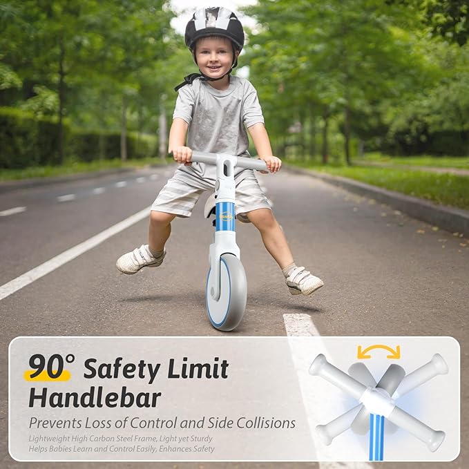 - Enhance Safety & Limited Steering: this balance bike for 2 year old toy offers limited steering 90° to help prevent toppling over or oversteering when they’re learning to turn around. Ergonomic integrated composite handle, non-slip and easy to grip for added comfort and safety