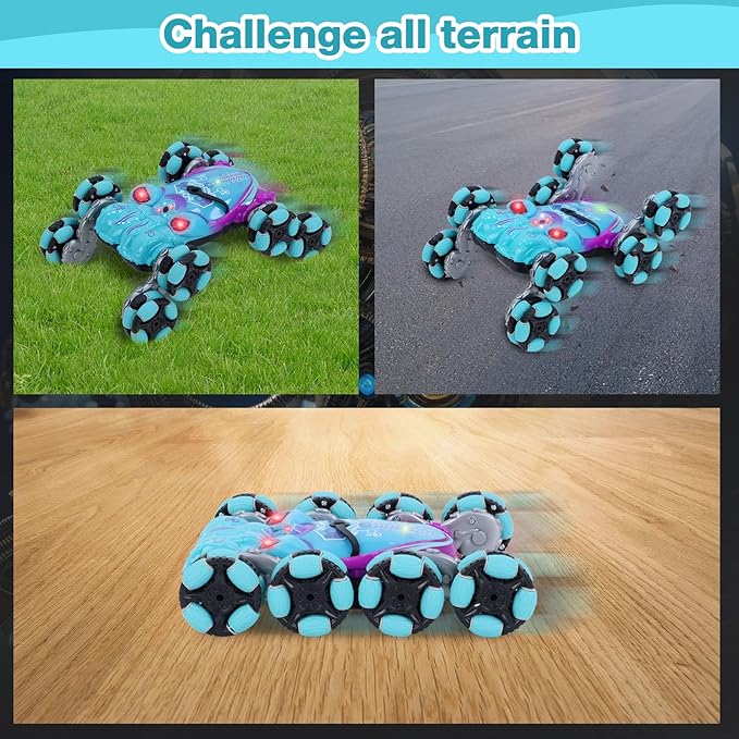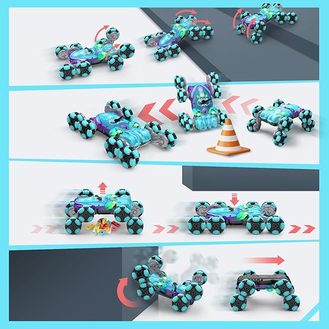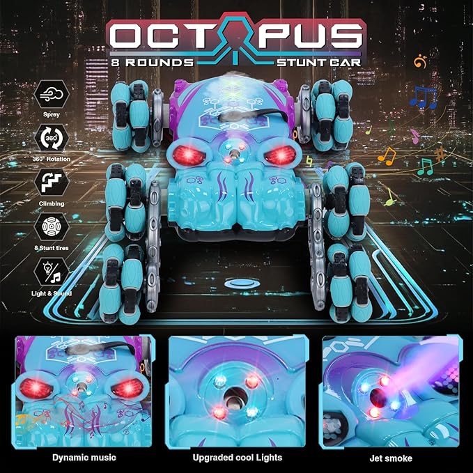 - NEW UPGRADED RC CARS WITH COOL LIGHTS AND SPRAY:This RC stunt car boasts an 8-wheel drive system, allowing it to navigate various terrains indoor and outdoor with ease. It responds to both remote control and gesture sensing. Built-in lights, music, and spray functions add a futuristic touch, making it even more enjoyable.The car is equipped with a spray system, when activated, sprays a cool mist while the headlights are on, instantly making your car stand out.