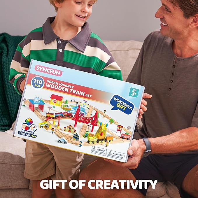 - 110-Piece City Train Set: This comprehensive train set includes wooden train tracks, 6 magnetic trains, 5 themed vehicles, a helicopter, and a ship with a fishing puzzle. Designed as a city-themed toy, it features 7 different themes, encouraging creativity, imagination, and hands-on skills. Ideal for children aged 3-8, this toddler train set offers endless assembly options and fosters teamwork and family fun.