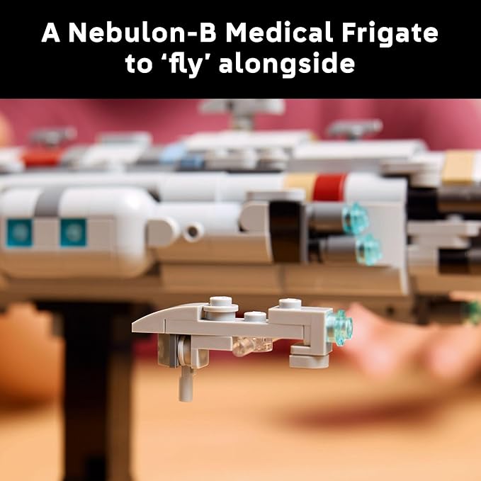 - BUILD AND DISPLAY – Showcase your creation on the stand with a nameplate, and use the transparent piece to attach a brick-built Nebulon-B Medical Frigate as if it’s flying alongside