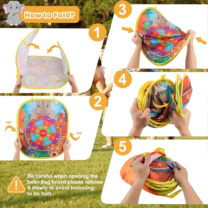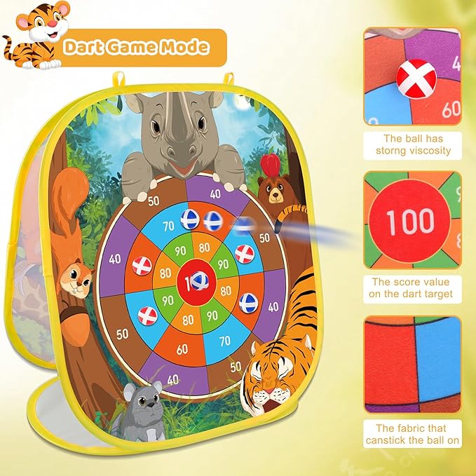 - 4 in 1 Bean Bag Toss Game: This animal-themed bean bag game is an indoor and outdoor game designed for toddlers that combines four ways to play: an easier bean bag throwing game and a harder dart game; The right hole can be thrown into the bean bag, the ball with the adhesive can accurately throw darts and it also can be a ring toss game. It can meet children's multiple play needs.