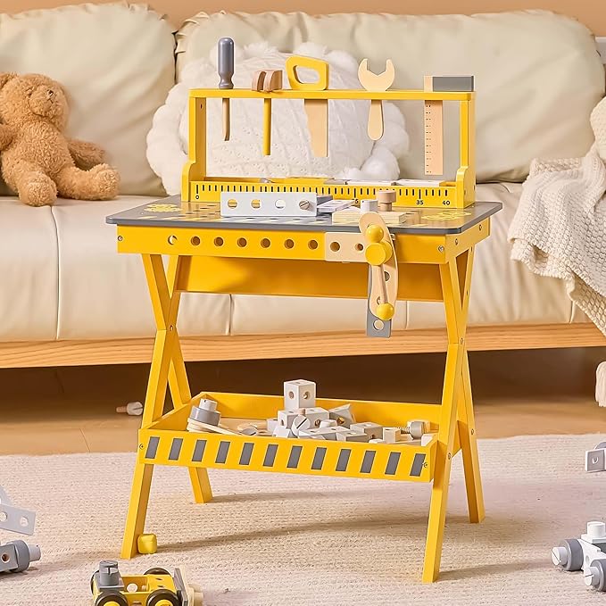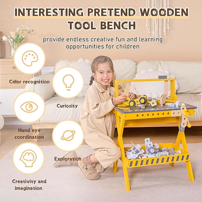 Kids Tool Bench with Sturdy Wood, Toddler Workbench with Realistic Toy Construction Set, Toy Tools Set and Multiple Ceative Pieces for 3-6 Year Old Boys and Girls, Yellow