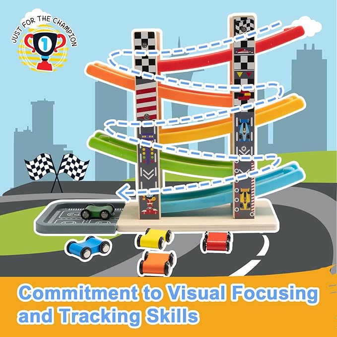 - LEARNING THROUGH PLAYING:WOOD CITY toddler race track is just a simple but well-built toy. It can be used not only as a craft decoration in children's rooms but also as a toy to pass time or play with partners, which will encourage the development of your toddler's hand-eye coordination and improve visuals tracking ability
