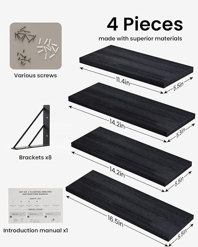 BAYKA Wall Mounted Floating Shelves, Wood Floating Wall Shelf for Books & Decor, Small Space-Saving Display & Organizer(Black,Set of 4)