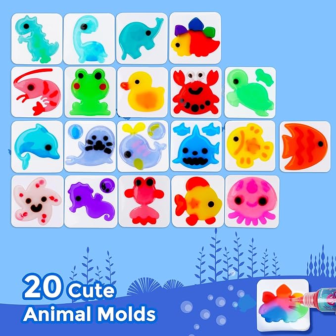 - The Squishy Maker Kit includes 20 animal molds, featuring popular ocean creatures and dinosaur molds, perfect for creating 3D water magical creatures. This DIY kit lets kids make their own squishy toys, encouraging creative play and imaginative fun.