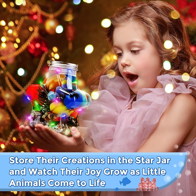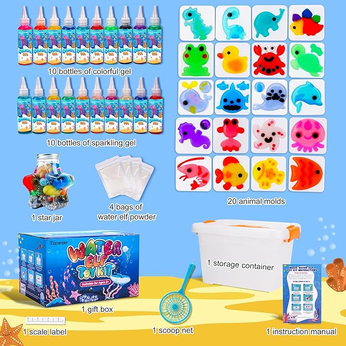 - Complete Set with Everything You Need for Creative Fun: This water gel toy kit comes with a comprehensive set of accessories, including 20 animal molds, 20 bottles of sparkling and colorful gel, a scoop net, a star jar for storage, a scale label, a detailed instruction manual, and 4 bags of water elf powder. All packed in a beautifully designed gift box, making it the perfect gift for kids ages 4 5 6 7 8 12 Years Old to enjoy hours of imaginative play and creativity!