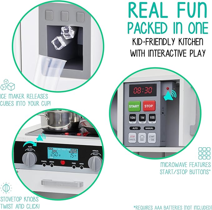 - SUPER REALISTIC SIGHTS & SOUNDS | Much More Than a Toy, Our Interactive Design Enables Meaningful STEM Kinesthetic Learning as Boys & Girls Immerse Themselves in a Real Kitchen Setup | Elements Include Battery-Operated Microwave, Oven, & Range w/ Light & Sound, Clicking Knobs, Ice Dispenser That Throughs Out Ice Cubes & Much More