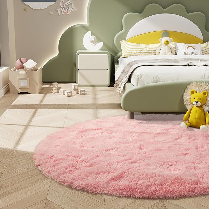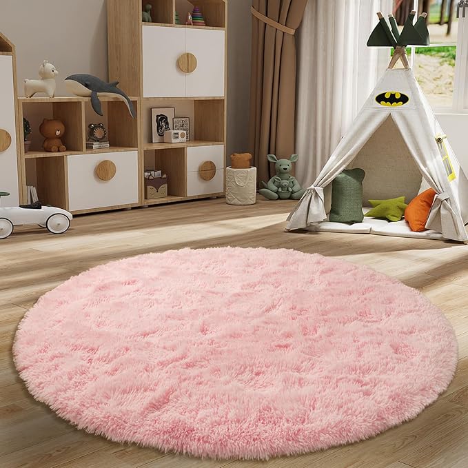 LOCHAS Luxury Round Fluffy Area Rugs for Bedroom Kids Girls Room Nursery, Super Soft Circle Rug, Cute Shaggy Carpet for Children Living Room, 5x5 Feet Pink