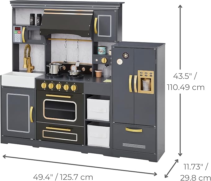 - CONTEMPORARY SHAKER STYLE: This two-piece play kitchen has a dark gray finish with gold hardware and white accents