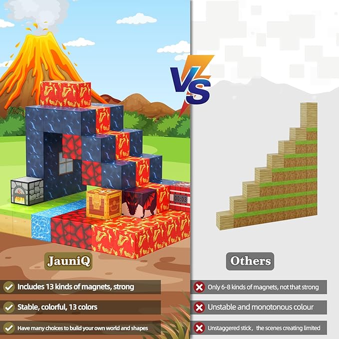 - Start your forest adventure world :100 pieces magnetic world set includes odsidian*10,flowers*7,lava*13,stump*6,Grasses*24,red brick*17,redstone*12,window*1,water*6,hest*1,furance*1,bomb*1,ender dragon*1, build their little castle or various forms. Children can get a strong sense of color, magnetic poles, and architectural design at an early age, and it can awaken your child's creativity, more cubes, and more opportunities to unleash your child's creativity.