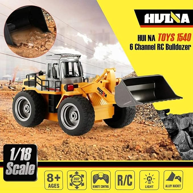 - [1:24 RC bulldozer]-Front and real 4WD full-function 1:24 scale RC front-end loader in different directions forward, backward, left and right, push the remote control bulldozer up and down. The loading arm of the remote-controlled truck loader can be raised and lowered independently, making the operation more fun.The metal cab and bucket of the remote control toy tractor loader greatly improve the loading capacity of the remote control toy front loader.