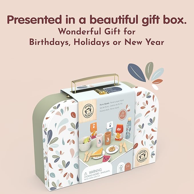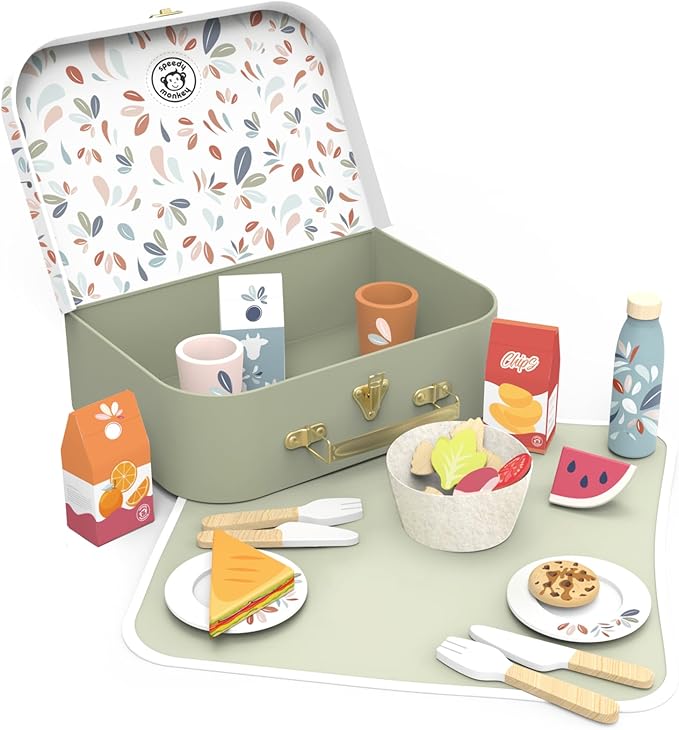 SPEEDY MONKEY Wooden Picnic Basket Playset β FSC Certified Pretend Play Food & Fruit Toy for Toddlers & Preschoolers, Outdoor Picnic Travel Adventure, Kitchen Role Play Set for Boys & Girls